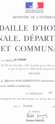 Cette séance du Conseil municipal a débuté par la remise du document établi par le Ministère de l’Intérieur attribuant la médaille d’Or d’honneur Régionale, Départementale et Communale à Michel Barrionuevo pour plus de 35 années de mandat à la ville de Sassenage en récompense de son dévouement au service des collectivités locales.